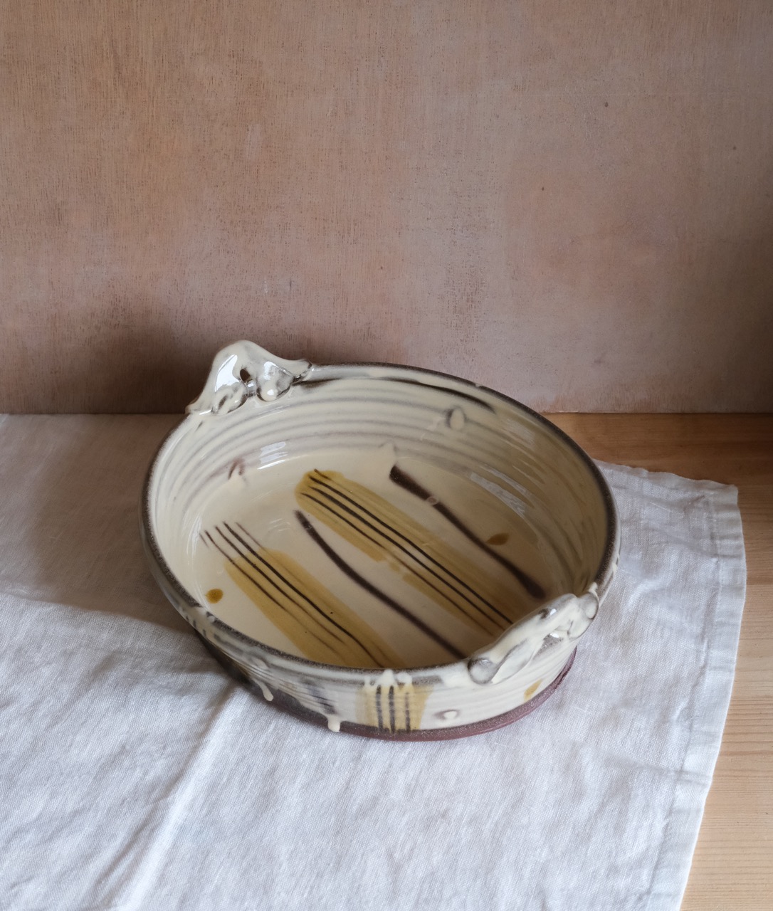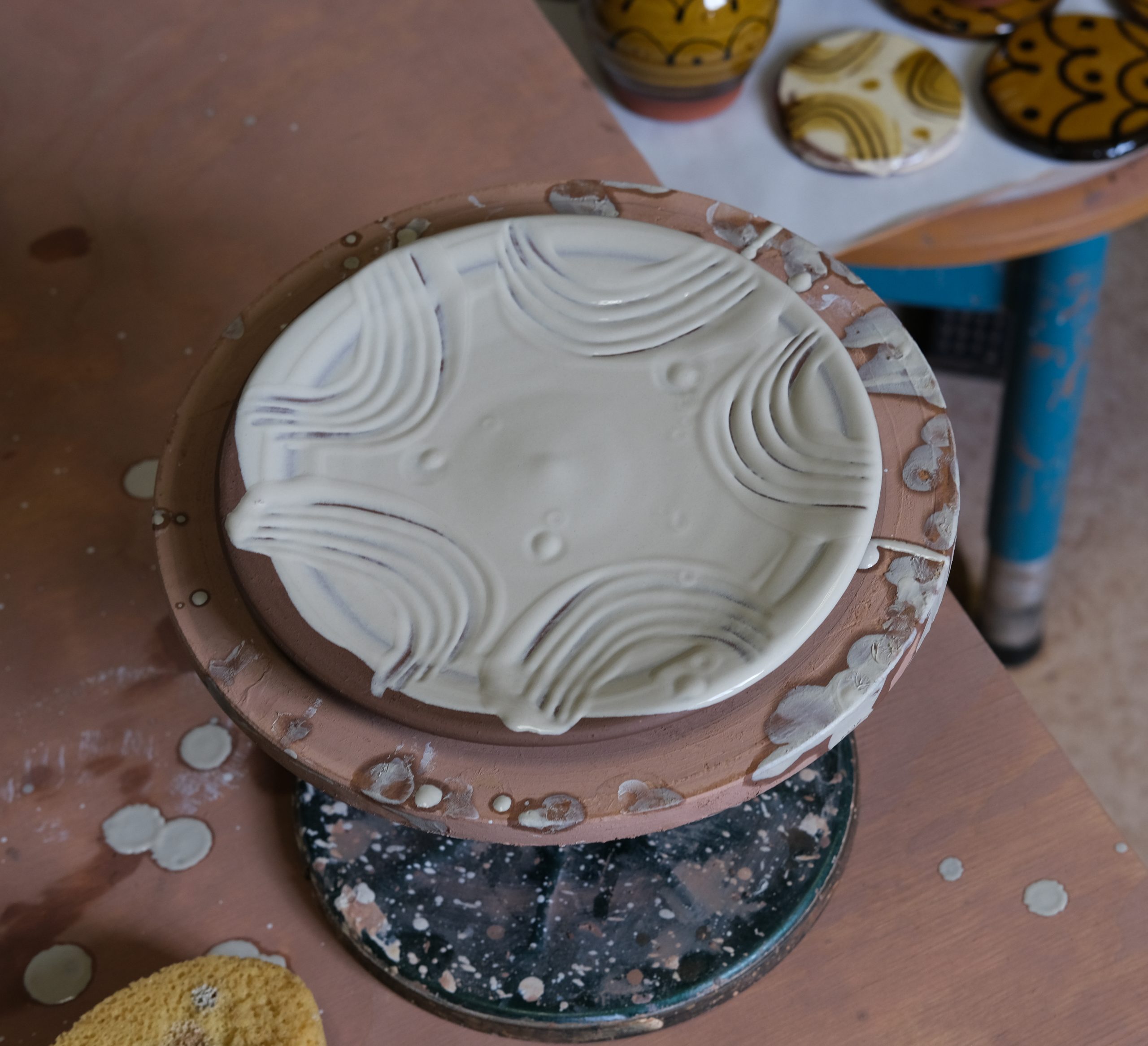 Students will be learning about the use of slip in low-fired earthenware and practicing slip application techniques. Students will learn how to work with wet-slip decoration, using slip trailers, marbling, feathering and other methods to make spontaneous gestures of decoration to the beautiful slipware pieces.